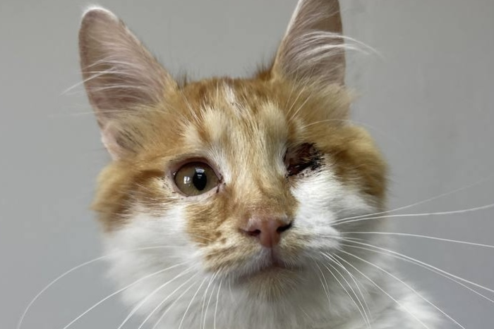 Симпотичный бело-рыжий котик, который очень нуждается в своем человеке. У котика отсутствует один глазик